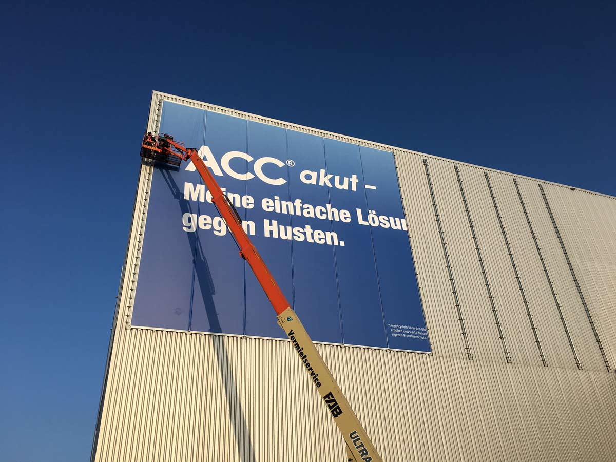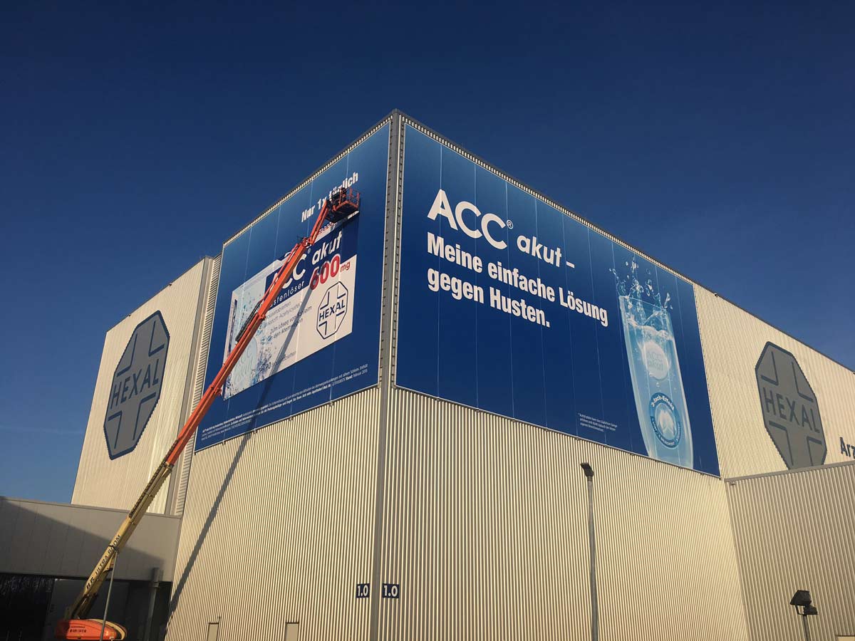 Nachdem es einen Monat zuvor erfolgreich den riesigen Schriftzug „HEXAL“ auf dem Dach des Salutas-Gebäudes angebracht hatte, hüllt das schwindelfreie easymedia-Team nun auch die südwestliche Ecke in neue Werbeplanen. Die riesigen und ca. 1000 qm großen bedruckten Banner lassen sich schon von der A2 aus bewundern.
