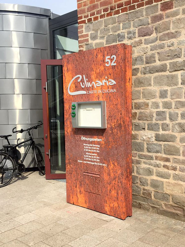 In Anlehnung an das vorhandene Logo sorgte das Team von easymedia mit der Außenwerbung für den nötigen Schwung. Neben den großen PROFIL 3 Leuchtbuchstaben an der Fassade ist der dekupierte Pylon in Rost-Optik, mit integriertem Post- und Speisekartenkasten, ein echter Hingucker.