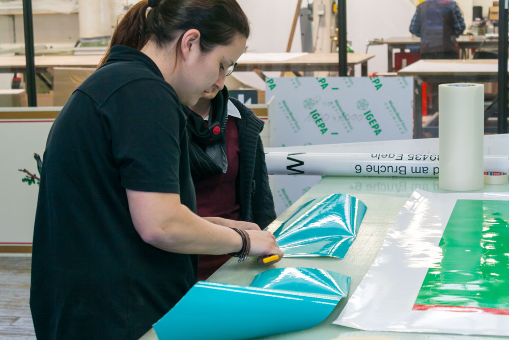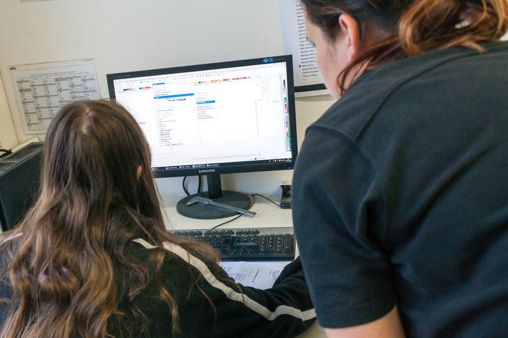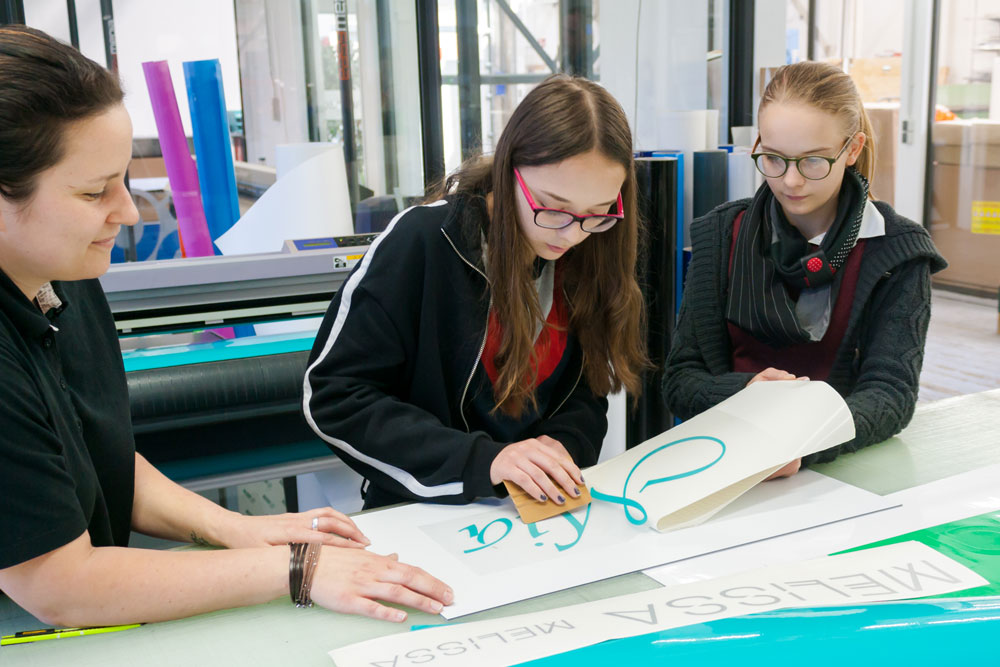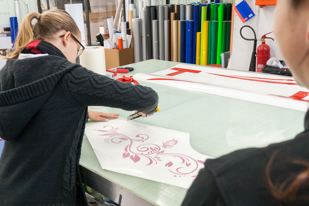 Zu diesem Anlass begrüßte easymedia heute die beiden 12- und 13-jährigen Mädchen Mia und Melissa. In der Full-Service-Agentur konnten sie ihre Fähigkeiten praktisch erproben. So erstellten sie am Computer eine Fahrzeugbeschriftung nach eigenen Interessen und legten bei der Folierung selbst Hand an, von der Gestaltung über den Plot bis hin zum finalen Bekleben. Beide hatten sichtlich Spaß und bekamen als Andenken ein Wandtattoo sowie den Namen in ihrer Lieblingsfarbe als Folienschnitt mit nach Hause.
