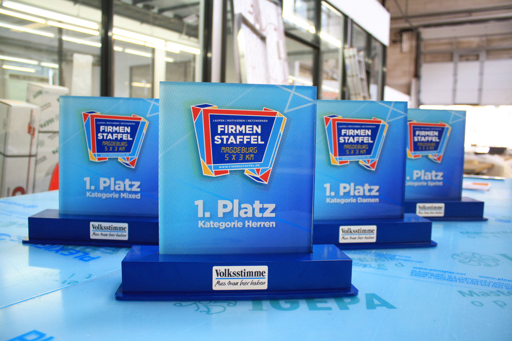 Am vergangenen Donnerstag bewiesen 1.000 Teams mit 5.000 Läuferinnen und Läufern aus über 500 Firmen erneut Teamgeist bei der jährlichen Firmenstaffel im Magdeburger Elbauenpark. In diesem Jahr wurden anlässlich des 10. Jubiläums den Erstplatzierten aus den Kategorien Damen, Herren, Sprint und Mixed erstmalig Pokale überreicht. Die vier Pokale wurden in der Produktionshalle der easymedia GmbH gefertigt und bestehen jeweils aus einem pulverbeschichteten Sockel in der Logofarbe und einer beidseitig bedruckten Acrylglas-Scheibe. Das Team der easymedia gratuliert den diesjährigen Siegern und ist hoch motiviert für die Firmenstaffel 2019.