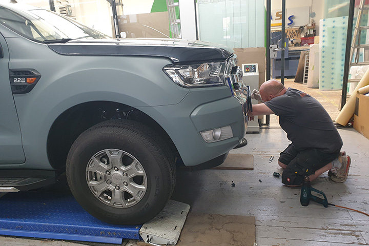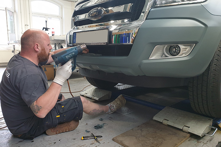 - Der Pick-up wird nach Kundenwünschen foliert. Dazu wird die Folie erhitzt.