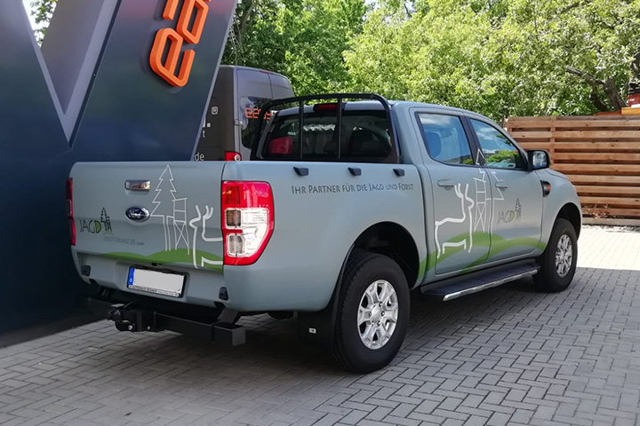 Neue Optik, frischer Schriftzug – der Kunde Jagd- und Forstservice GmbH hat seine Fahrzeuge in die Hände unserer Werbe-Profis gegeben. Zuerst wurden unsere Grafiker tätig, die die Fahrzeugfolie nach Kundenwünschen am PC geplant und gestaltet haben. Anschließend haben sich unsere Werbetechnik-Profis an die Arbeit gemacht: alle Fahrzeuge samt Türgriffe wurden vollfoliert. Der matte Grauton macht ganz schön was her. Final erhielten alle PKW Schriftzüge mit Logo an allen Seiten sowie auf der Motorhaube.