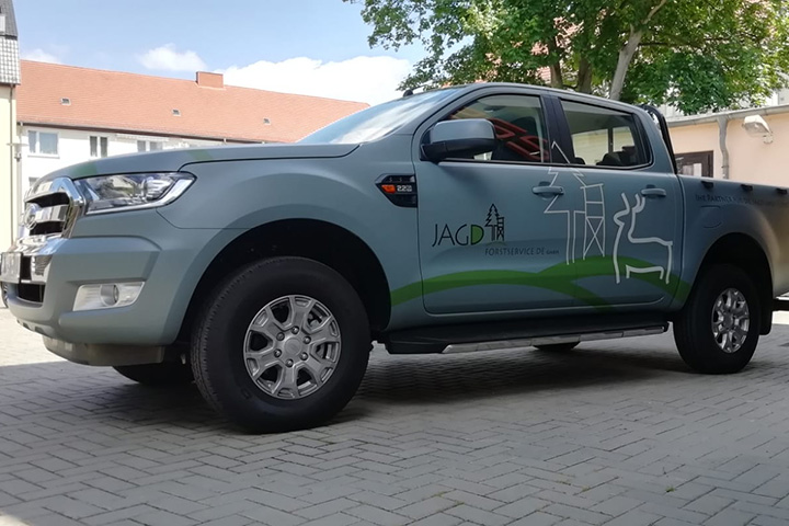 Steine fliegen, Äste kratzen: Die Fahrzeuge der Jagd- und Forstservice GmbH bei Möckern im Jerichower Land müssen vielen Hindernissen standhalten. Touren durch Wald und Flur erfordern eine robuste Fahrzeughaut. Die perfekte Lösung bietet das Car Wrapping by easymedia.